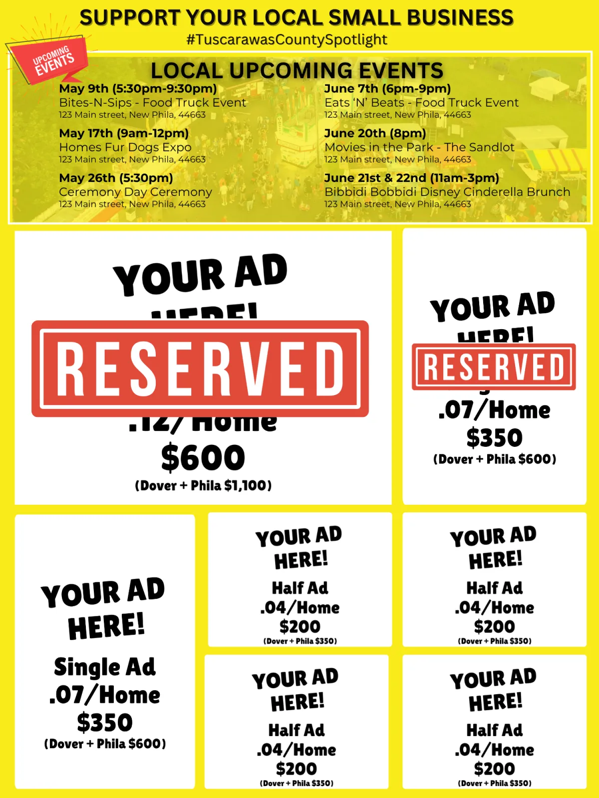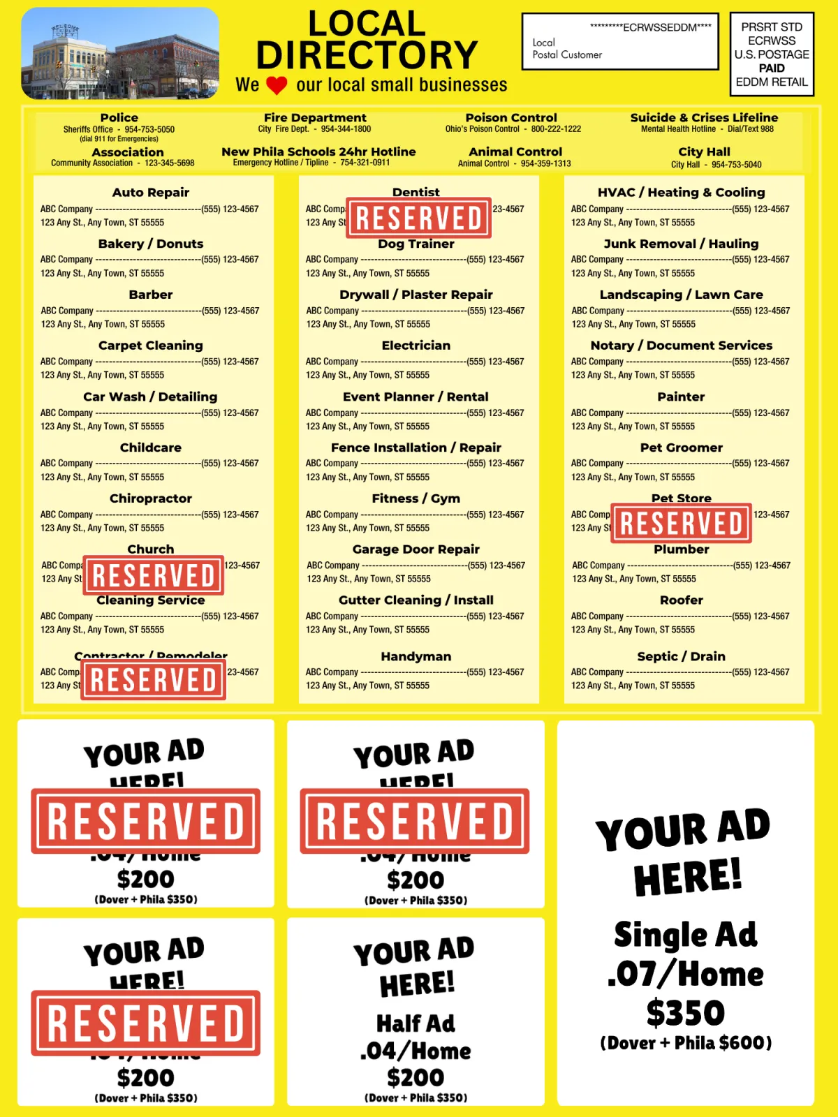 Our oversized, glossy postcard is designed to stand out in the mailbox — not get tossed like cheap flyers. With a local business directory and a community events calendar, it’s something residents actually keep on the fridge and refer back to.